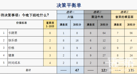 比如決策今晚下班吃什么,你既想要減肥,又想要好吃,還想要省錢,一頓飯得滿足多種需要,自己左右為難,內(nèi)心糾結(jié)。這時候一個決策平衡單,填入你的待選項,再填入你的需要(價值標(biāo)準(zhǔn)),標(biāo)注好重要程度,就來打分,如下圖,就吃家里的番茄面吧!