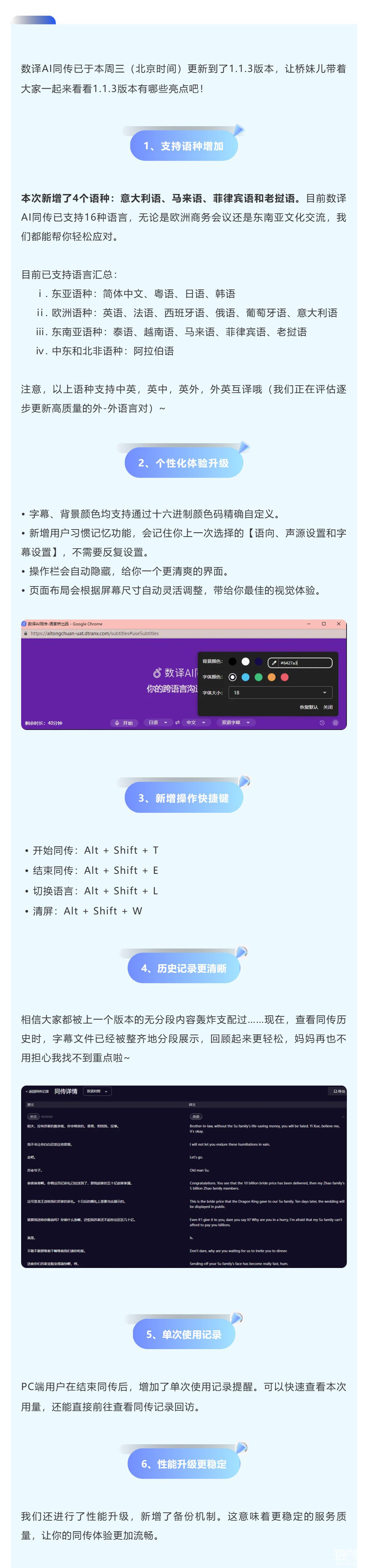 "數(shù)譯A同傳又雙叒愛更新啦!上周四我們發(fā)布了最新的V1.1.4版本。本次更新帶來了多項(xiàng)實(shí)用功能,讓橋妹兒帶大家一起來看看吧~ "...[查看更多]