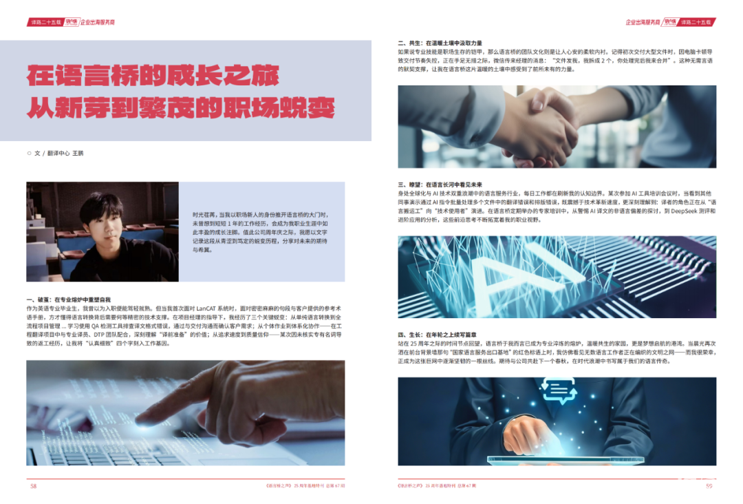 這是他來到翻譯中心的第一年,他說:”譯者的角色在從語言搬運工向技術(shù)使用者演進(jìn),對AI技術(shù)的思考不斷拓展著我的職業(yè)視野,期待與公司共赴下一個春秋,在時代浪潮中手寫屬于我們的語言傳奇。“