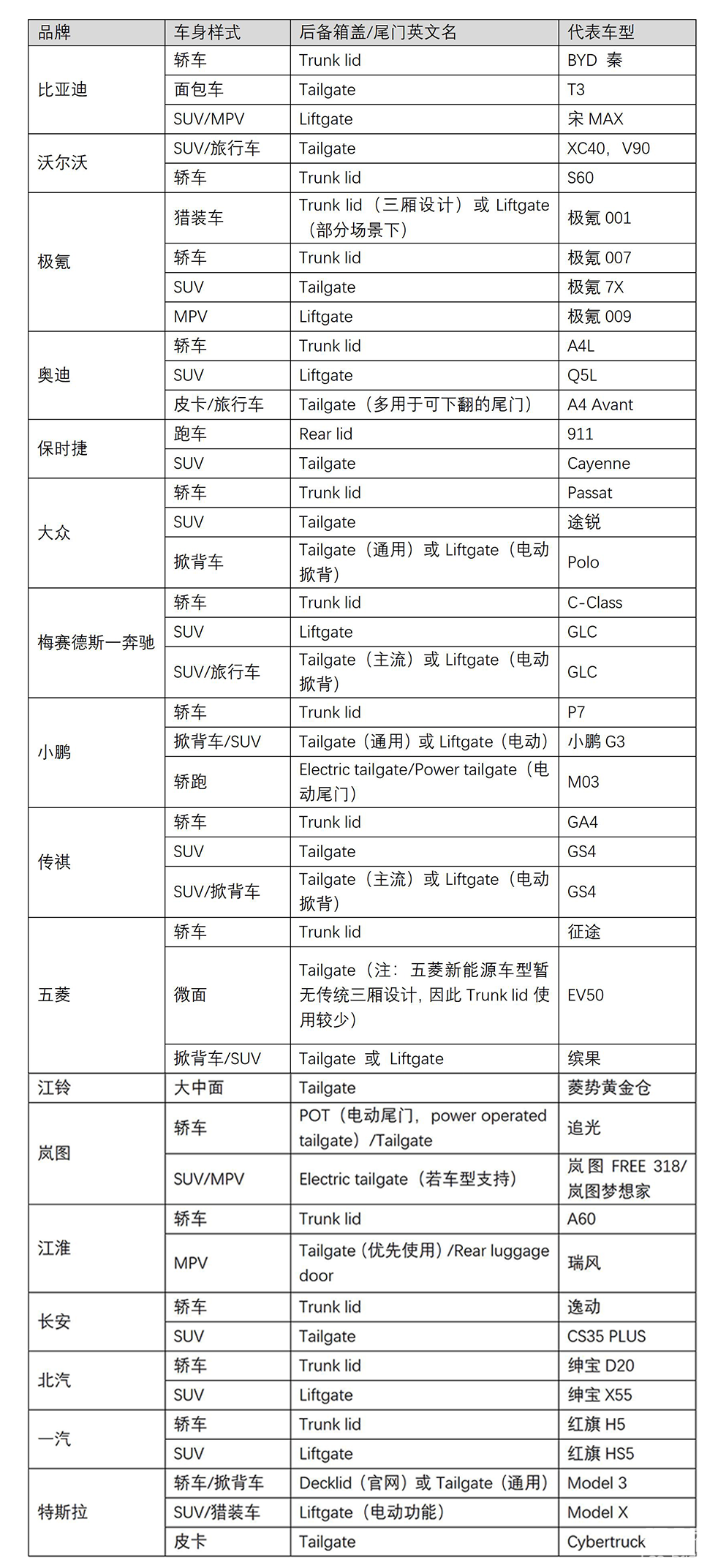 盡管筆者搜集了大量信息以確保本文的準(zhǔn)確性,但由于不同車輛的獨(dú)特性以及車企自身的命名選擇,市場(chǎng)上各類車輛的后備箱蓋和尾門的英文名稱并不統(tǒng)一。因此,具體名稱取決于車企及車輛的款式和型號(hào)。下表為部分車企的后備箱蓋和尾門英文名稱,可供參考(信息可能會(huì)更新):
