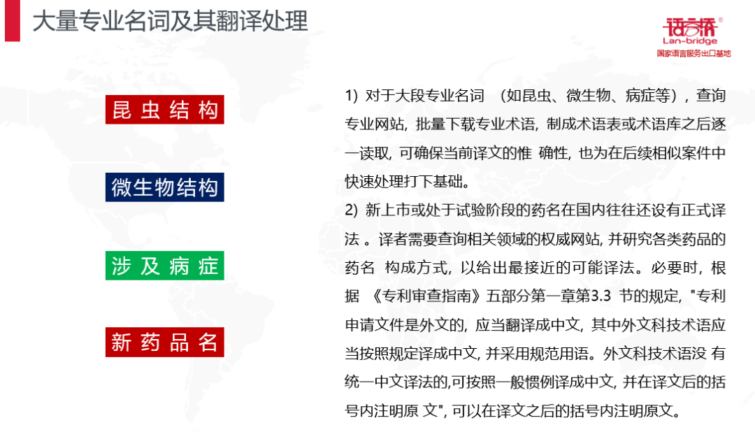 生物醫(yī)藥領(lǐng)域有大量的基團(tuán)結(jié)構(gòu),相似句式,相似表達(dá),昆蟲結(jié)構(gòu),微生物結(jié)構(gòu),涉及病癥,新藥品名稱等等,如果沒有前期的經(jīng)驗(yàn)和術(shù)語積累,這也將會(huì)成為翻譯路上的絆腳石,語言橋在這些方面做了大量的分析和儲(chǔ)備,確保譯文的高質(zhì)量輸出。