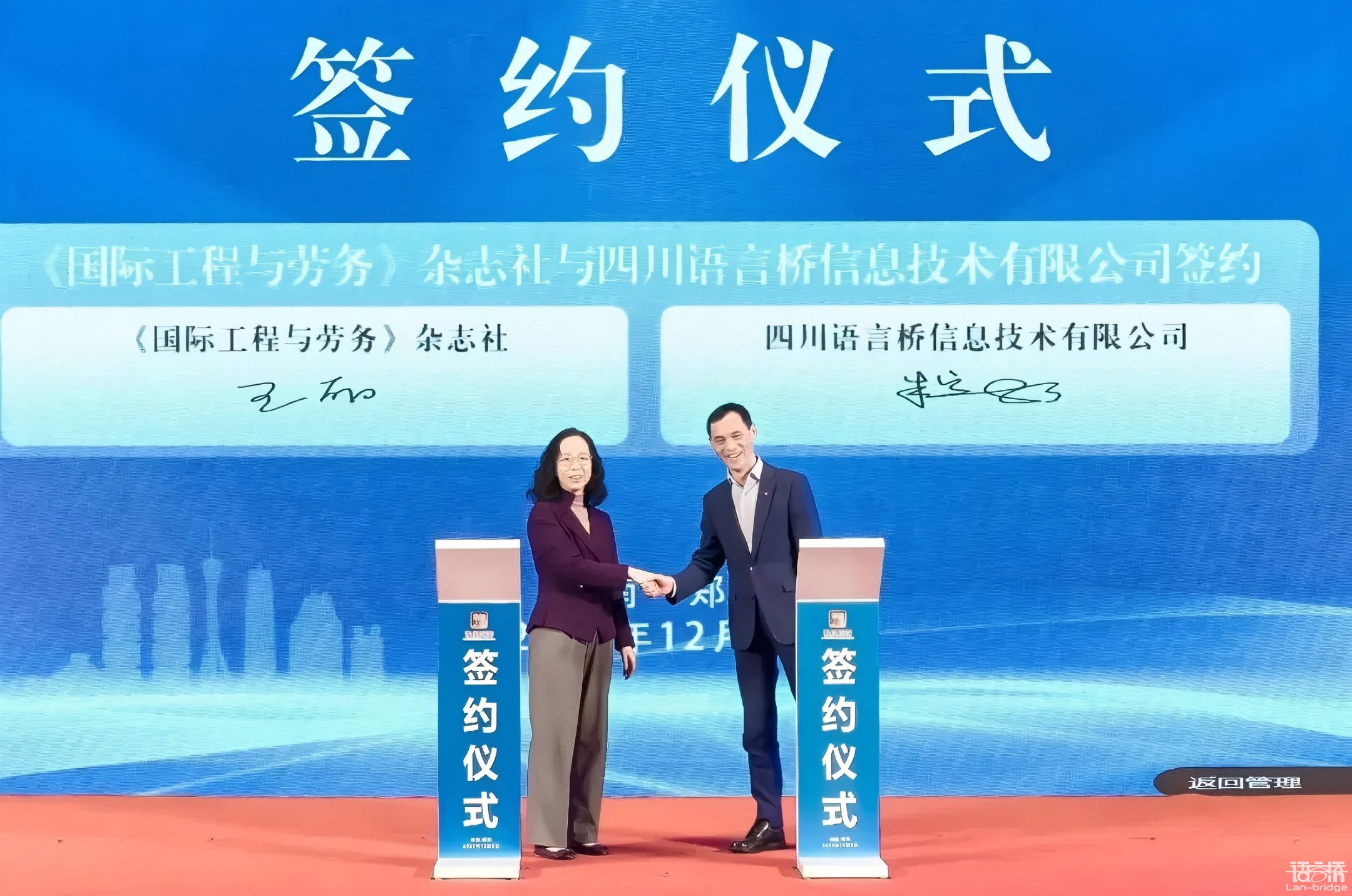 12月5日,承包商會(huì)《國(guó)際工程與勞務(wù)》雜志社與四川語(yǔ)言橋信息技術(shù)有限公司(簡(jiǎn)稱語(yǔ)言橋)舉行戰(zhàn)略合作簽約儀式。雜志社社長(zhǎng)王麗、語(yǔ)言橋董事長(zhǎng)朱憲超作為雙方簽約代表,共同簽署合作協(xié)議,續(xù)寫(xiě)為期五年的戰(zhàn)略合作新篇章。
